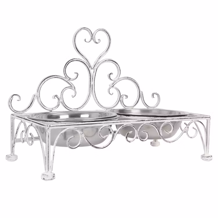 Två foderskålar på vit metallställning i Shabby Chic stil. Vitmålat järn med fin svart patina.