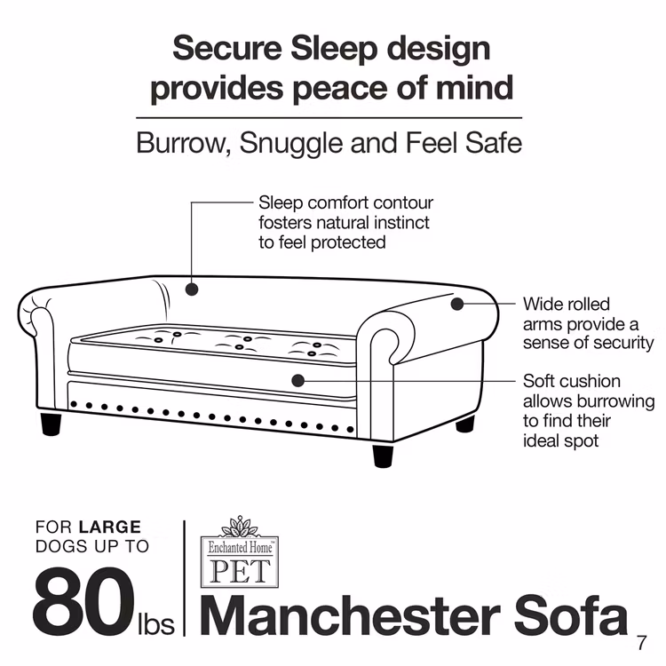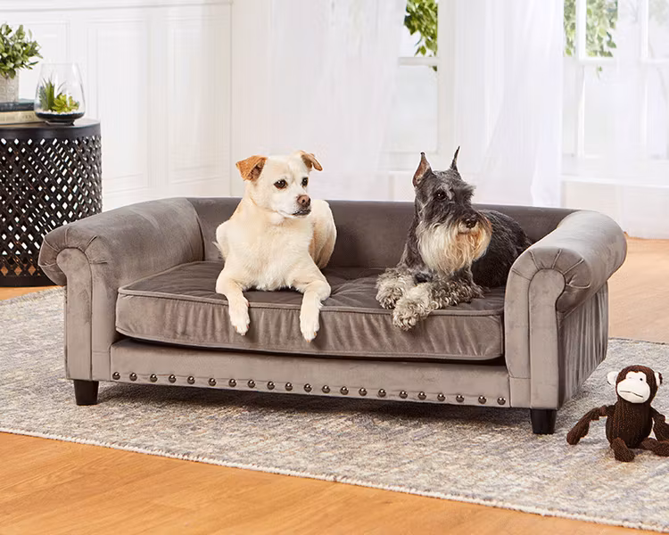 En lyxig och bekväm hundsoffa i grå färg med snygga nitar och djuphäftade knappar på kudden. Soffan har snygga rullade armar och rygg som är väldigt bekvämt och mjukt för din hund att luta sig mot. Helt klädd i sammet med högkvalitativa material med möbel konstruktion som gör den riktigt stabil och gedigen.