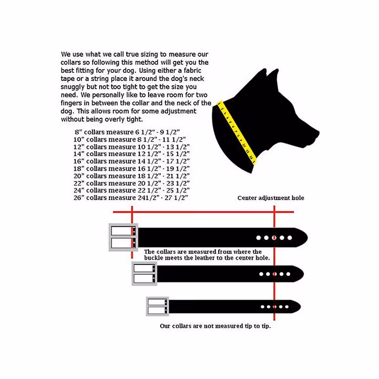Halsbandens Storlekar: Måtten på halsbanden är från spännet möter lädret och till mitten hållet.