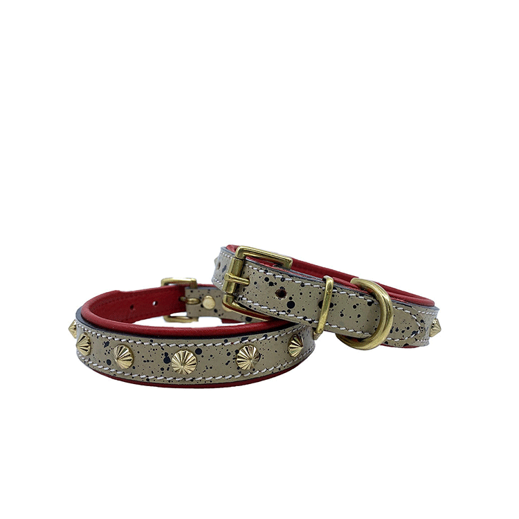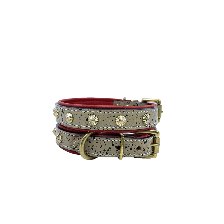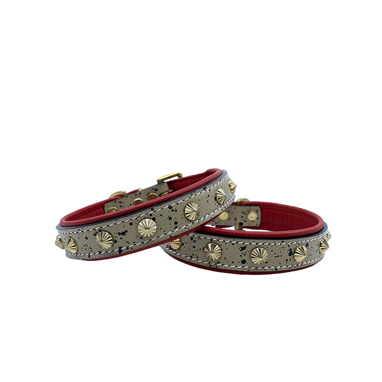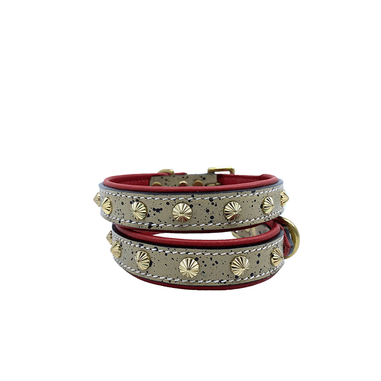 Ett lyxigt halsband i läder med snygga guld färgade nitar runtom (ej vassa). Halsbandet passar er som har t.e.x. en Chihuahua eller Yorkshire Terrier. Super skön passform i mjuk vadderad läder med rundade kanter för maximal komfort. Noggrant och högkvalitativt tillverkat för hand. Stiligt i alla situationer!