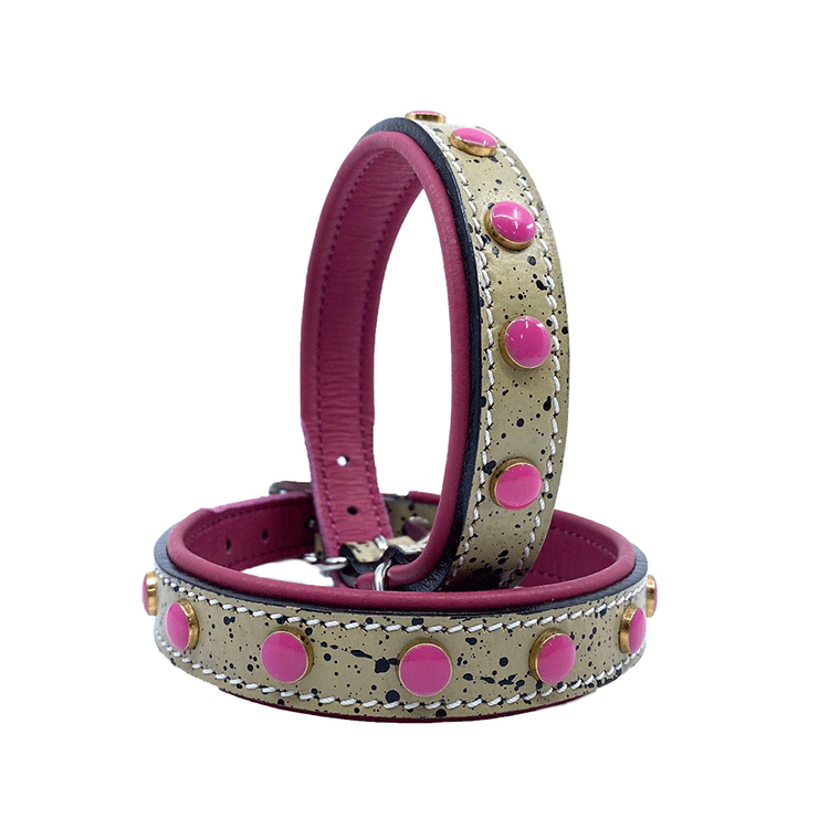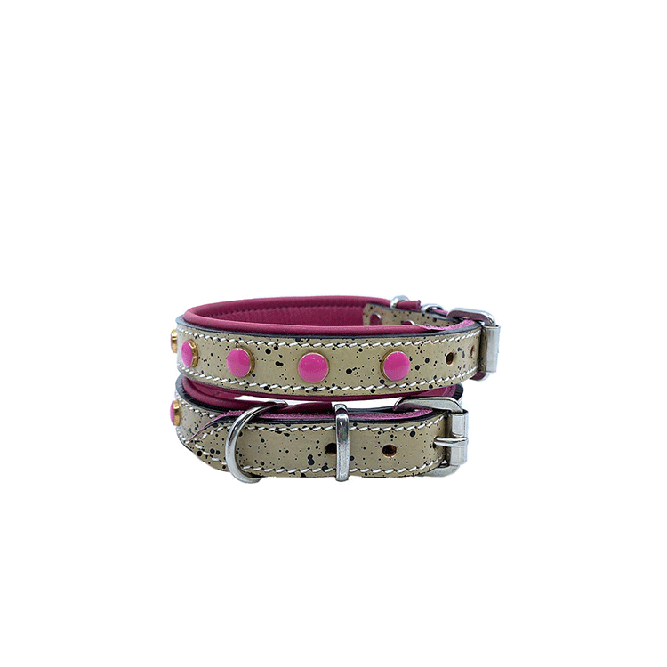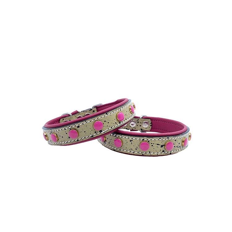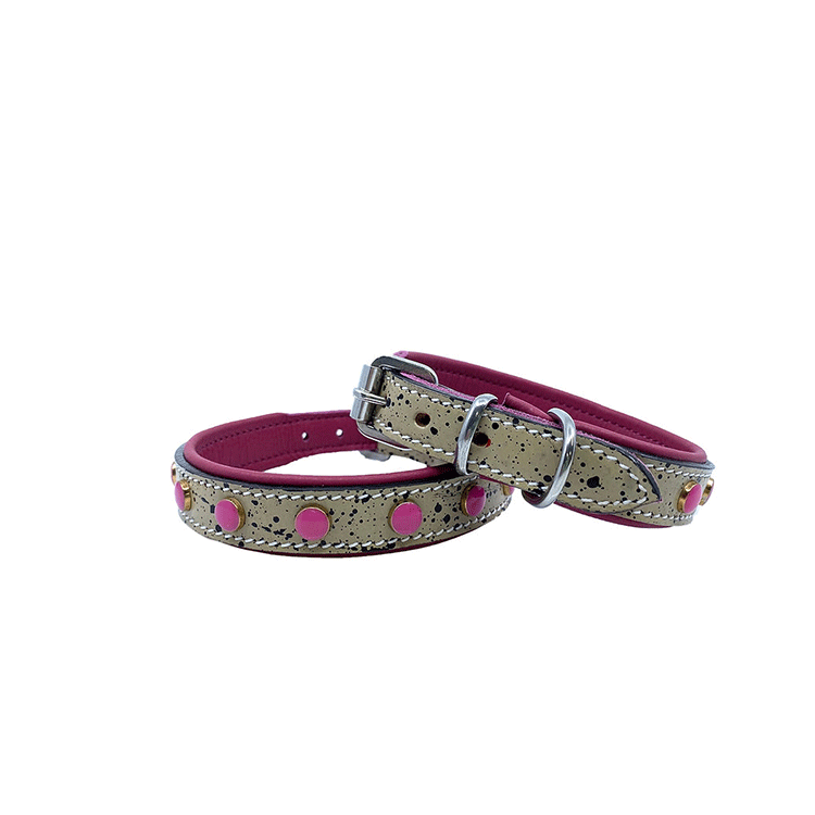 Ett gulligt litet halsband som kommer passa jätte fint till dig som har t.e.x. En Chihuahua eller Yorkshire Terrier. Halsbandet är vadderat med rundade och mjuka kanter som gör att den kommer sitta jätte skönt på din hund. Snygg design med svart stänk och rosa fina pärlor runtom hela halsbandet.