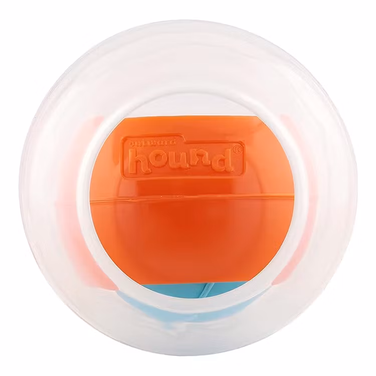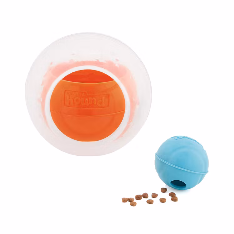 Rolig aktivitetskula med lätt svårighet från Nina Ottosson. Fyll den blå bollen med torrfoder eller godis och placera den sedan inne i den orangea cylindern.