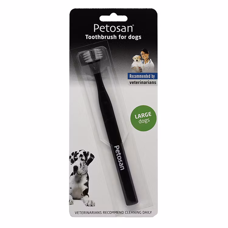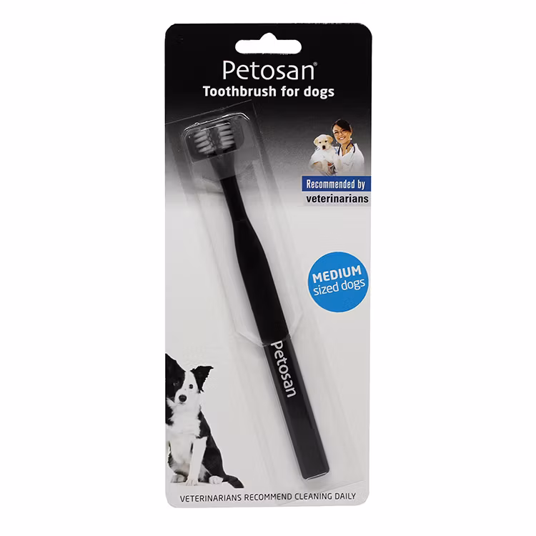 Tandborste med dubbla borsthuvuden som rengör båda sidorna av din hunds tänder i samma rörelse. Sparar tid under tandborstningen och gör det till en behagligare upplevelse för hunden. Tandkräm finns att köra separat.