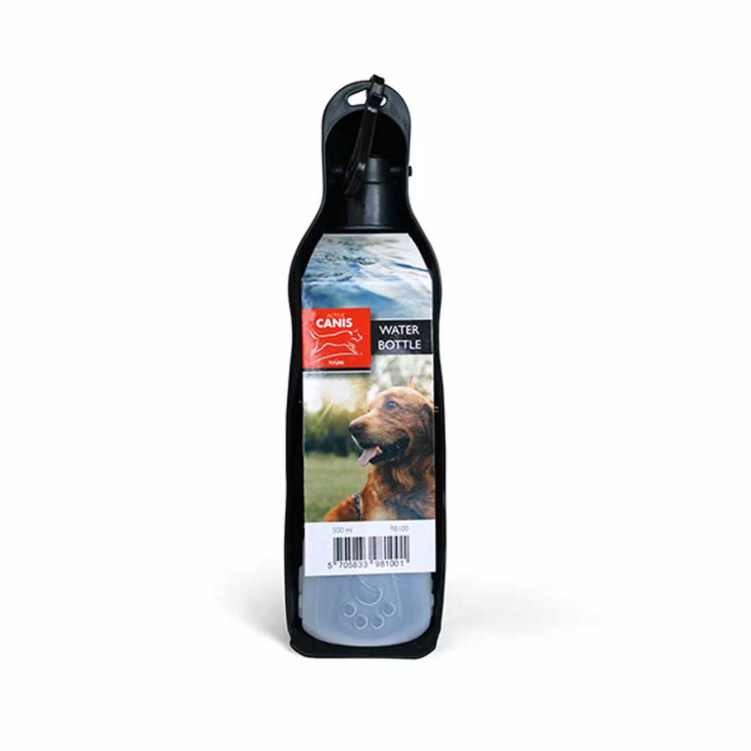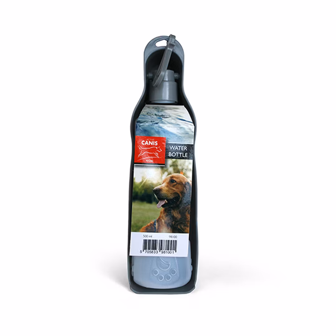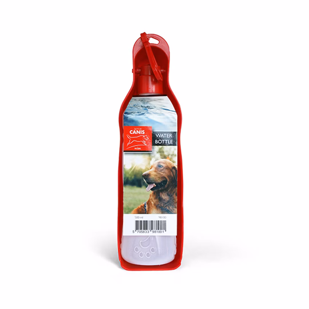 Smidig vattenflaska perfekt att ha med sig på promenader och utflykter. Flaskan fälls ut ur ett hölje och sedan hälls vattnet ut inuti höljet som hunden kan dricka ur. Flaskan har en hake som går att fästa i ett bälte eller annat för att lämna händerna fria.