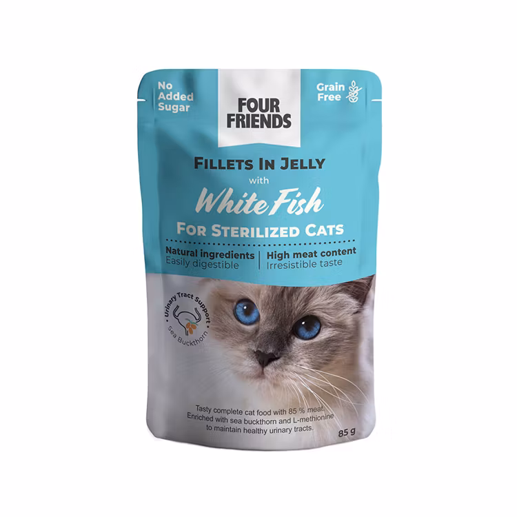 Helfoder för vuxna steriliserade katter i smidiga portionspåsar på 85g vardera. Paketet innehåller tre olika smaker för katten att variera emellan. Här i hittar du kalkon, lamm och vit fisk. All mat är berikad med havtorn och L-methionine som är bra för urinvägarnas hälsa.