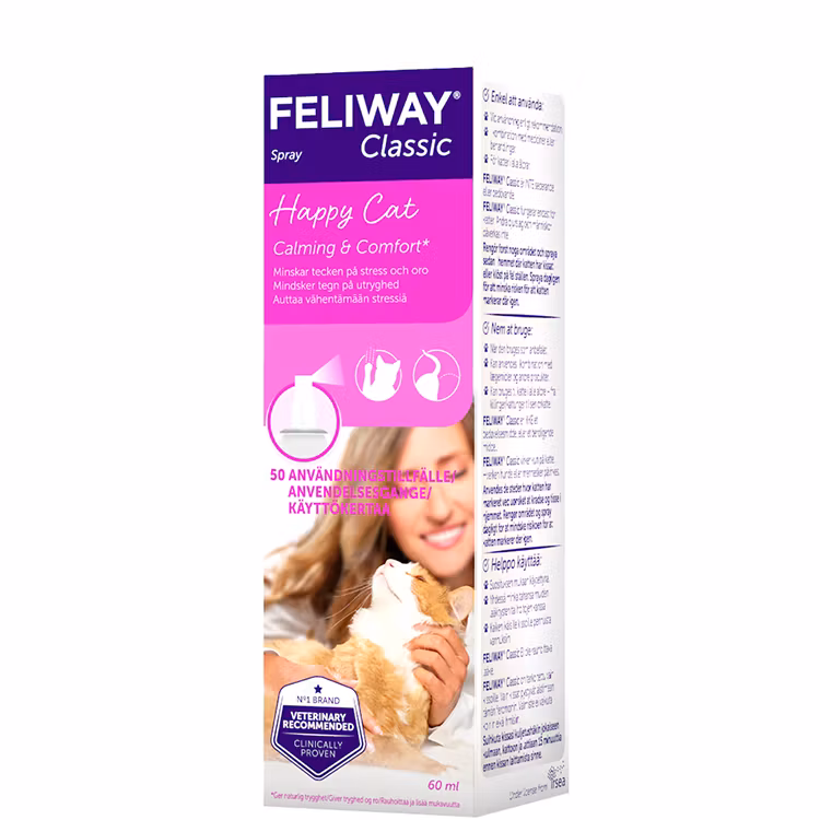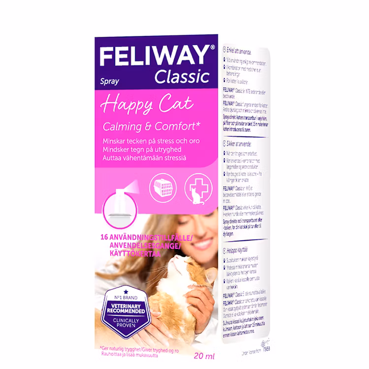 Feliway Classic i smidig sprayflaska. Jättebra att ha vid veterinärbesök, bilturer, nya möbler m.m. Spraya i rummet, transportbur, bilen och andra ytor som katten kommer vistas på 30 minuter innan. Feromoner kommer ge katten en känsla av trygghet och lugn som kan göra stor skillnad för katten i stressiga miljöer och situationer.