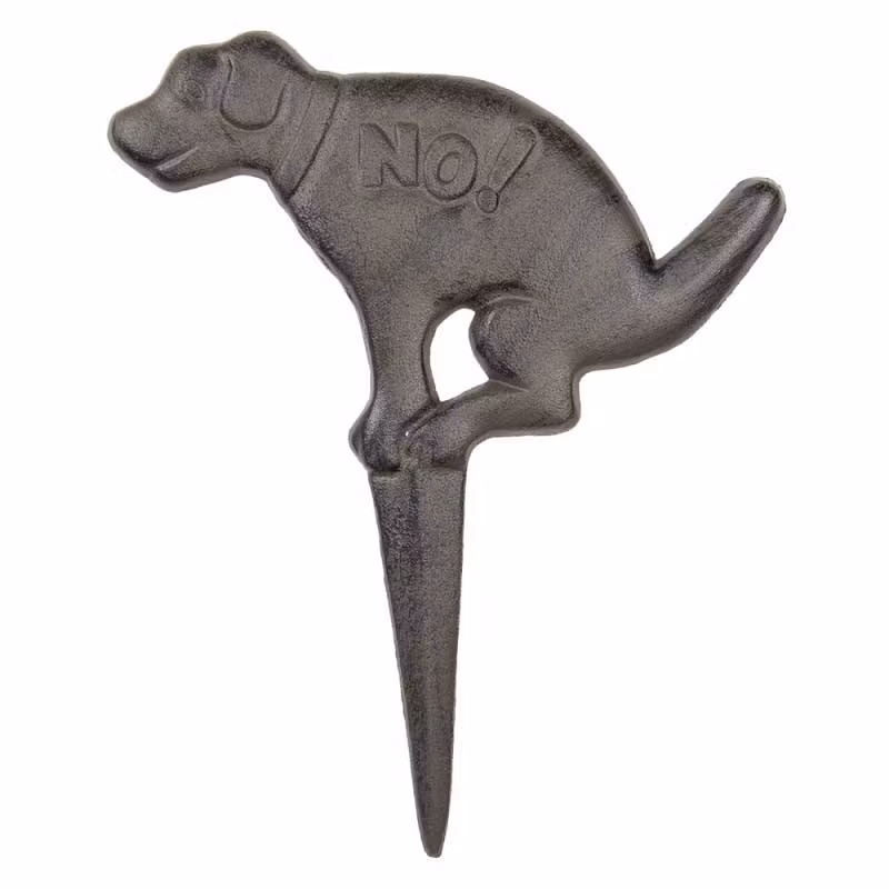 Ett något humoristiskt trädgårdsspjut med en hund i full färd med att uträtta sina behov. På hunden står det "No!" så har man en gemensam yta t.ex. vid en bostadsrättsförening eller liknande så gör dessa sig utmärkt där. Spjutet är av gjutjärn så med tiden kommer detta få en vacker patina av rost.